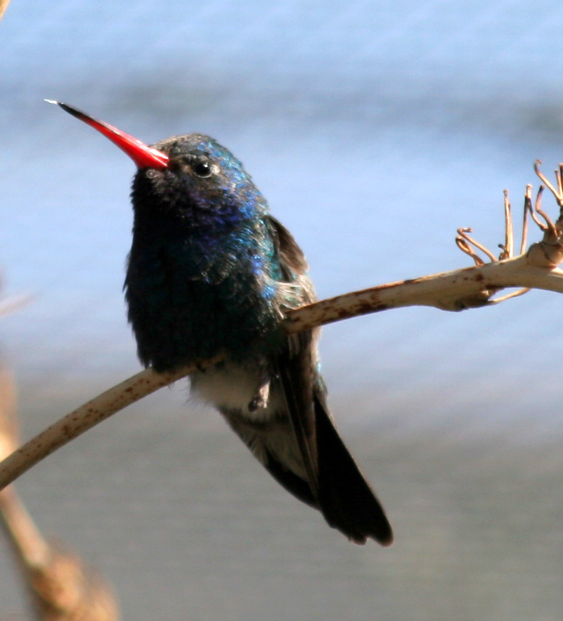 SaddleBrooke’s most beautiful and unmistakable hummingbird is the Broad-billed. The male has an iridescent turquoise head and crown, a blue chest, dark wings and an orange bill ending in black at the tip.