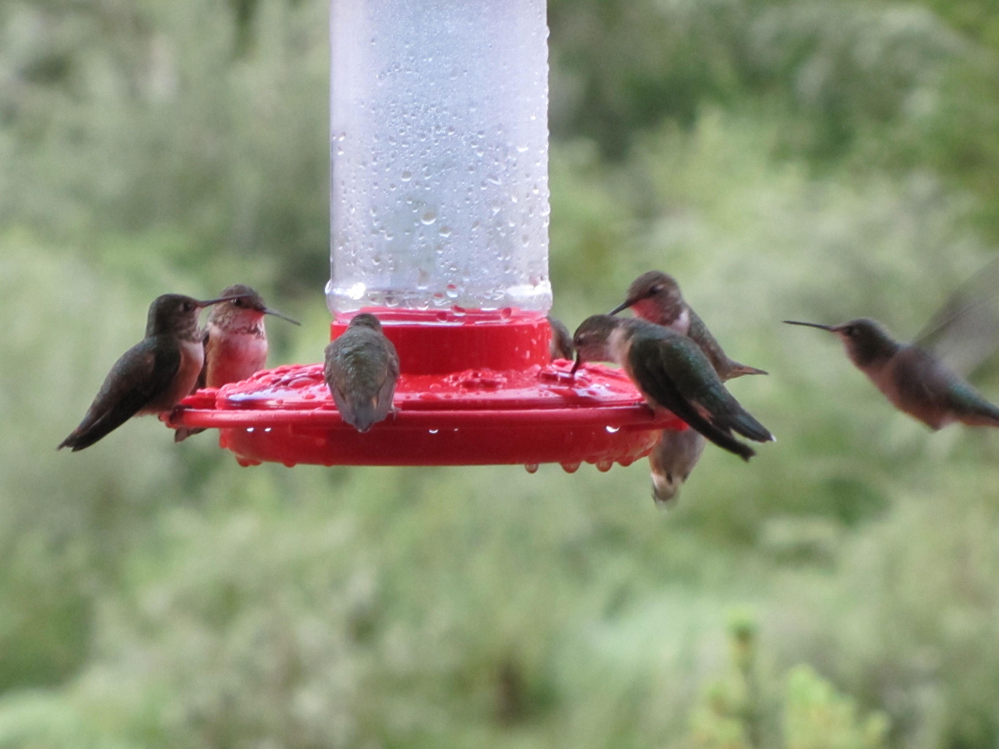 And where is dad throughout these trying times?  Well, he’s hanging out with the guys over at the local nectar bar.  When female hummingbirds are working their tails off looking for nesting sites, the males are bar-hopping, finding the best feeders or flowers in town and doing their best to keep them to themselves.  Males will stake out the biggest territory they think they can defend, and then spend more time fighting with other birds than drinking.  While the females shun makeup, slave over nest-building and deal with demanding kids, the males get gussied up (Costa’s dress up in purple, Anna’s in bright red and Broad-billed in iridescent blue), pick fights and hog the bar stools.