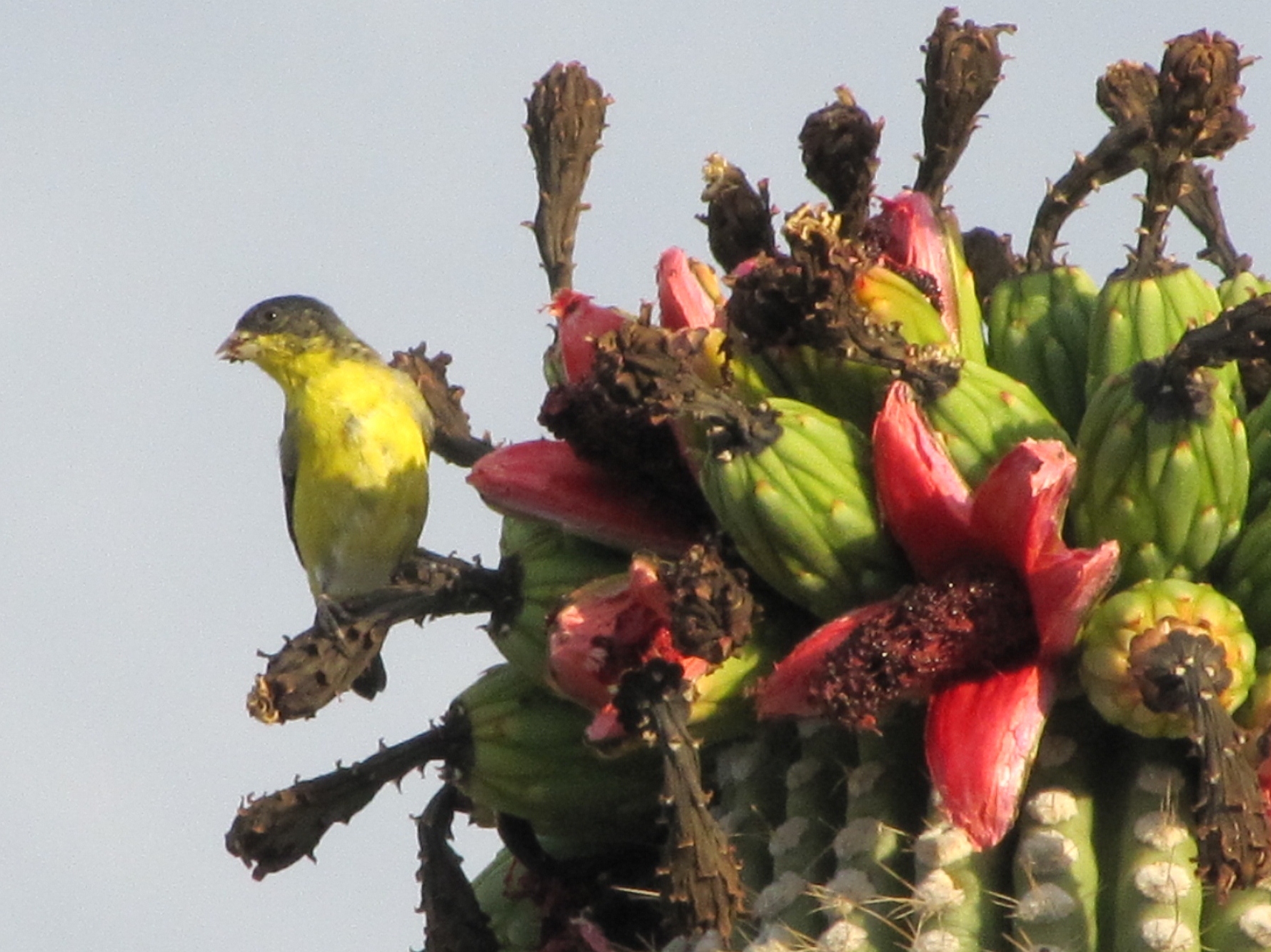 Since birds are always present, a garden that produces a variety of food year-round is ideal. The Arizona Native Plant Society and Tucson Audubon Society published an excellent guide to bird-oriented plant selection, Desert Bird Gardening. The booklet includes a table of 45 plants, showing which ones provide nectar, fruit, seeds and insects, as well as which seasons each flowers. For example, prickly pear flowers in spring, agave in summer, desert marigold in spring and fall and wolfberry in winter and spring. Baja fairy duster and chuparosa, which attract hummingbirds, Verdins and Cactus Wrens, are capable of blooming any time of the year. Other plants in this list include thistle, brittle bush, sunflower, mimosa, penstemon, pyracantha, trumpet, sage, salvia and pomegranate, one of my favorites. The large red flowers are magnificent in spring, and as the fruit ripens near year’s end, nearly every bird in the yard goes nuts over it. I’ve watched Verdins gorge on the nectar-filled arils while open-mouthed quail caught accidental discards below. Impale a half pomegranate on a nail in the top of a wooden stake and watch a parade of birds: thrashers, mockingbirds, cardinals, woodpeckers, sparrows and finches. And what better Christmas decoration than a tree loaded with large rose-red ornaments of fruit?