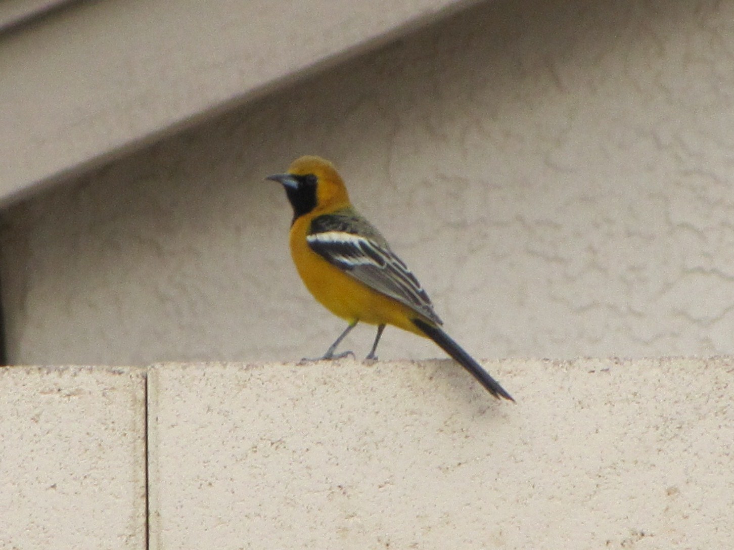 Our Hooded Orioles typically arrive in March, build a nest (they love palm trees), raise a family and head back to Mexico, usually by the end of September. Orioles eat insects, fruit and nectar, and are common visitors to hummingbird feeders. Although we don’t have a palm tree in our yard, our neighbor does, and for the past few years we have been fortunate enough to have a pair of Hooded Orioles nest there. These orioles frequent our hummingbird feeders and trumpet vines, so we get lots of opportunities to enjoy and photograph them. As usual, they disappeared in September 2010, heading back to their winter home in Mexico together with the rest of Arizona’s orioles. Well, most of them, anyway.