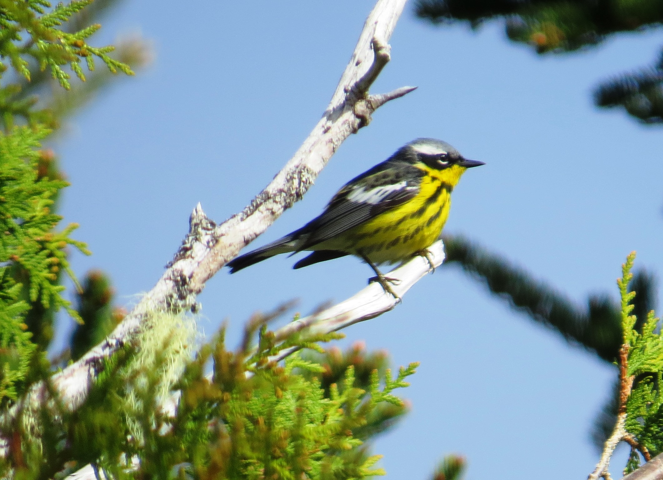 I used to wonder why warblers, vireos and Ruby-throated Hummingbirds would leave their bug-rich Mexican habitat to fly hundreds of miles north to nest in the spring. Now I know. I’ve been to bug-rich Mexico, but it doesn’t hold a candle to bug-richer Maine, home of the black fly. Black flies might be worse than mosquitoes, which, by the way, are also present. At least the males, which appear first, don’t bite like the females, but when you are picking hundreds of tiny black flies out of your facial orifices, it doesn’t seem to matter much. Fortunately, you can buy a bug net to cover your face and head, and, surprisingly, you can even use your binoculars while wearing it. It’s worth it to get a good look at a Magnolia Warbler.