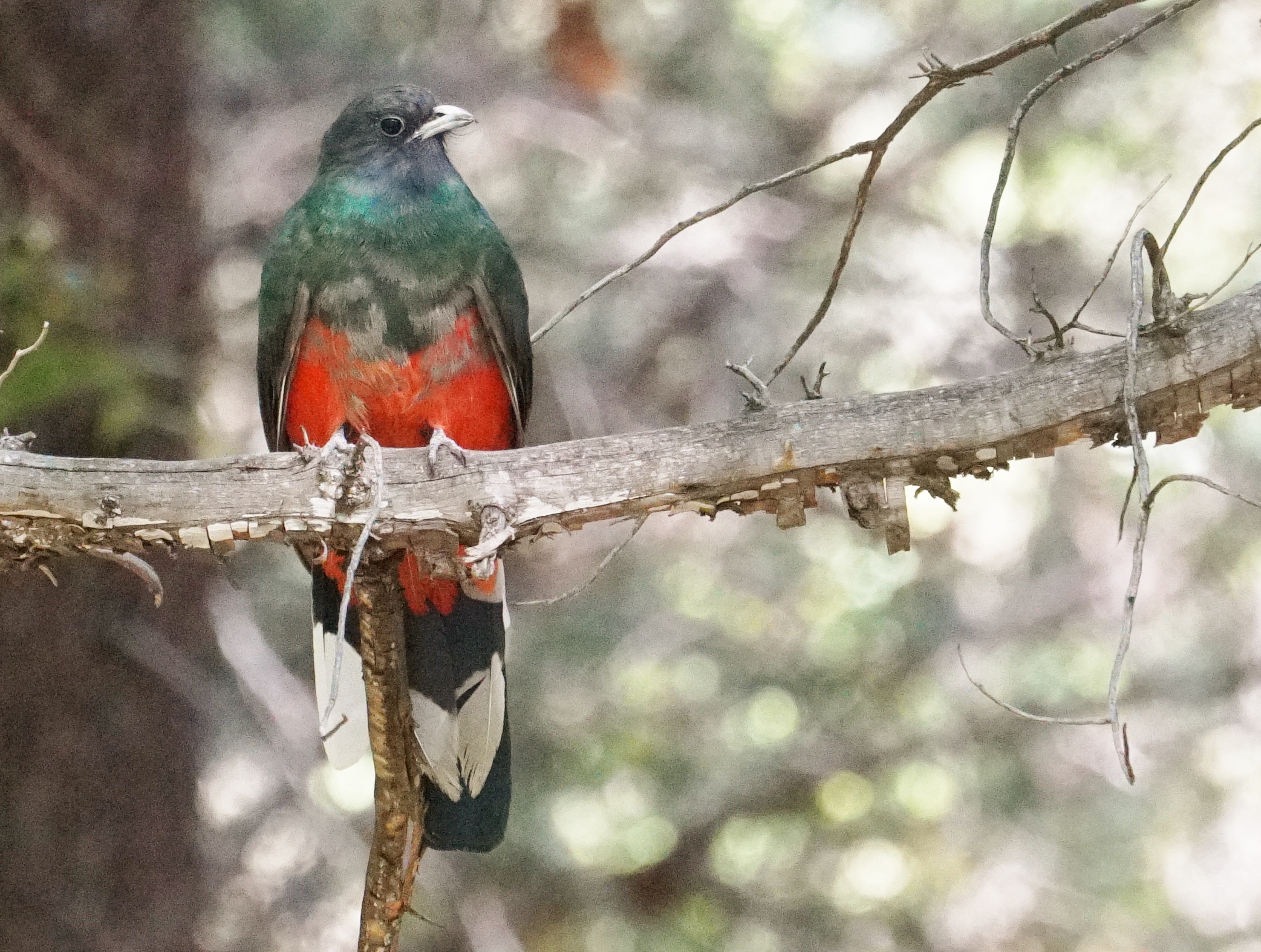 Although I’ve always loved birds, I didn’t get seriously into birding until January, 2008, when we took a multi-month road trip into Mexico. One of many highlights on that trip was a two-night campout in Reserva Monte Mojino, a private preserve in the mountains east of Alamos in southern Sonora. This is a very wild area where the focus is conversion of cattle ranches to conservation in order to protect an ecological treasure. There were a couple of biologists doing research at the ‘ranch’ where we camped, but Prudy and I were there for the birds. Our host was Stephanie Meyer, a U.S. expatriate biologist who rode with us in our Jeep, and without whom we never would have found the destination, just 17 miles from Alamos but which took nearly 3 hours to drive. We saw lots of great birds including Lilac-crowned Parrot, Tufted Flycatchers (as thick as bees) and Plain-capped Starthroat, but we never saw the Eared Quetzal, a rare and beautiful bird in its own genus, falling between trogons and true quetzals. At the time, I didn’t realize this would be my best opportunity to find one in Mexico, where they are endemic except for Arizona incursions