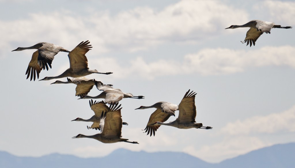 Six subspecies of Sandhill Cranes, some residential and some migratory, are found from northeastern Mexico, Cuba and Florida north across Canada and Alaska into northeastern Siberia. Their common name comes from Nebraska’s Platte River habitat on the edge of that state’s sandhills. Cranes from northern areas participate in massive migrations consisting of thousands of miles per year. These monogamous birds will feed and socialize for weeks in staging areas before migrating, and during migration they typically fly as high as 2,500 feet, although some have been recorded at 12,000 feet, and they will fly as far as 500 miles in a ten-hour day.